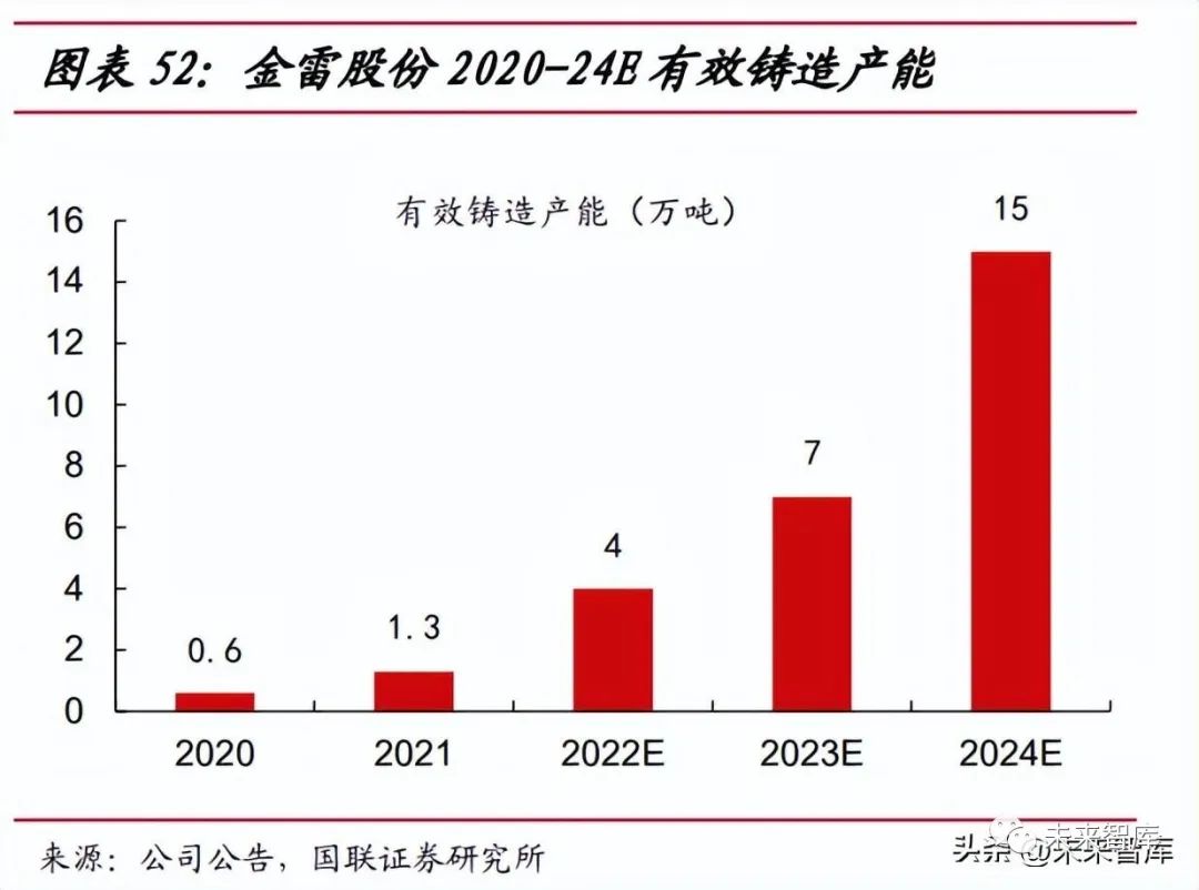 海風引領主軸鍛改鑄趨勢。風機大型化趨勢下主軸鑄造工藝趨勢明確,隨著大 型海上風機主軸尺寸越來越大,鍛造主軸因為生產(chǎn)設備的限制,不適用于大型風機;同時直驅和半直驅機型份額占比增加,主軸在中低速傳動工況下相比于雙饋高速傳 動性能要求略有降低,部分風電整機供應商基于降本壓力及輕量化的需求,鑄造主 軸占比將有望提升。龍頭金雷股份(44.320, -1.12, -2.46%)優(yōu)勢明顯。金雷股份東營海上風電核心部件數(shù)字化制造項目也在 持續(xù)推進中,項目規(guī)劃鑄造產(chǎn)能共 40 萬噸,目前一期工程已開工建設,規(guī)劃產(chǎn)能 10 萬噸,預計將于 2023 年中旬投產(chǎn),貢獻 50%的產(chǎn)能,2023 年預計公司鑄造產(chǎn) 能有望達到 7-8 萬噸,2024 年有望達到 15 萬噸。