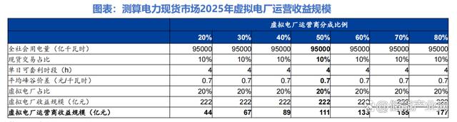 測算得到,通過電力現(xiàn)貨市場獲利模式下,當(dāng)虛擬電廠運(yùn)營商分成比例為50%時,虛擬電廠2025年運(yùn)營市場規(guī)模為111億元。