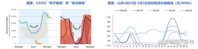 國內(nèi)以山東為代表的部分省份同樣有明顯的填谷需求。山東裝機(jī)結(jié)構(gòu)與CAISO相似,截至22年底,光伏裝機(jī)占比達(dá)到22.5%。在2023年五一假期期間,山東省內(nèi)用電負(fù)荷下降約15%,引發(fā)連續(xù)負(fù)電價現(xiàn)象。值得注意的是,4月29日-5月1日現(xiàn)貨價格曲線形狀類似鴨子曲線,期間10時-15時負(fù)電價出現(xiàn)尤為頻繁,而該時段為光伏發(fā)電高峰。
