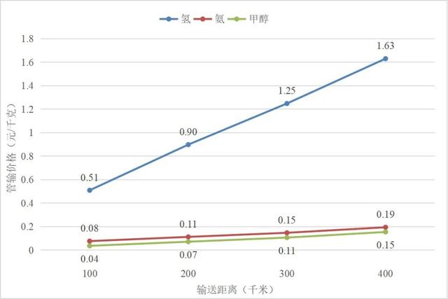 中期階段氫基能源長距離管輸價格與輸送距離的關系圖