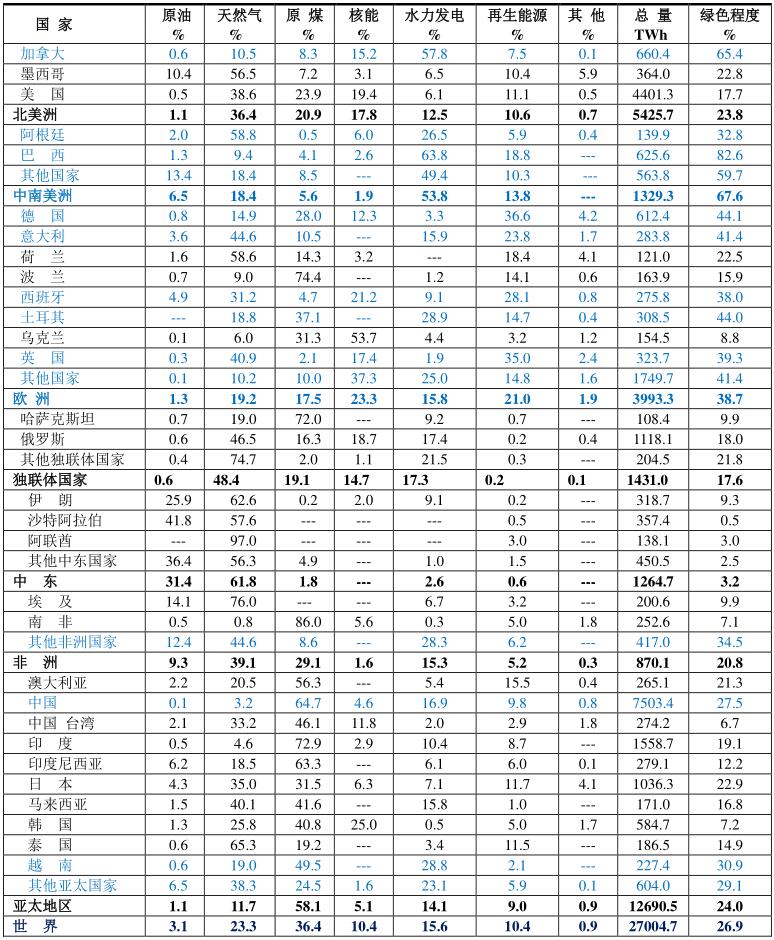 本資料根據(jù)BP 2020年報(bào)告的數(shù)據(jù),再經(jīng)過(guò)計(jì)算而成。本文所指的化石燃料是原油、天然氣和原煤構(gòu)成;非再生能源由化石燃料和核燃料構(gòu)成。綠色能源由水力發(fā)電、再生能源和“其他”構(gòu)成。“其他”指抽水蓄能、城市廢物發(fā)電等。綠色程度為水力發(fā)電、再生能源和“其他”的水力發(fā)電、再生能源和“其他”的%之和,用%表示。表中藍(lán)色表示這些國(guó)家綠色程度超過(guò)了世界平均值26.9%。