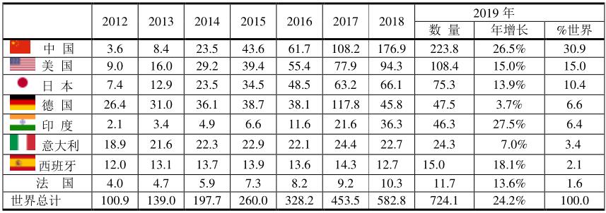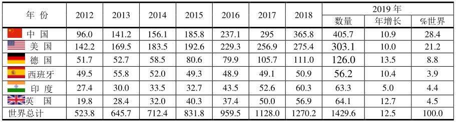根據(jù)BP 2020的報告,2019年全球太陽能發(fā)電占全球發(fā)電總量的724.1/27004.7=2.7%,占再生能源發(fā)電總量的724.1/7261.3=10.0%,其份額較少,但進(jìn)展較快。