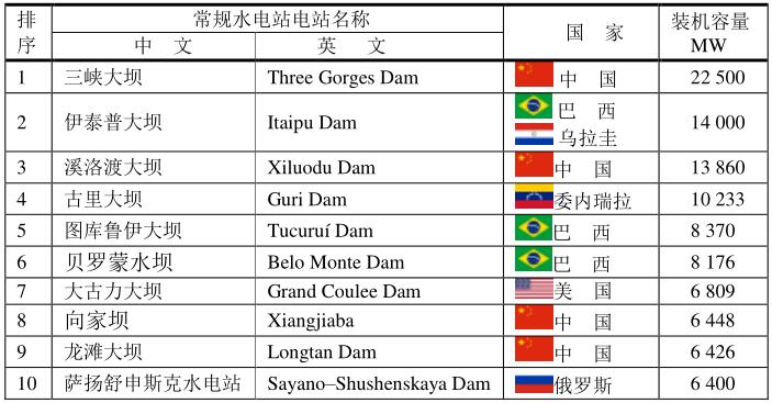 中國湖北省的三峽水電站仍然是世界上最大的水電站,總裝機容量為22.50 GW;位于巴西和巴拉圭的伊泰普水電站是世界第二大水電站,裝機容量為14.00 GW。不過,伊泰普水電站所處的巴拉那河水量豐沛且季節(jié)分布相對均衡,幾乎可以全年滿負(fù)荷發(fā)電;而三峽水電站則每年都會經(jīng)歷約6個月的枯水期,從而限制了其發(fā)電量。