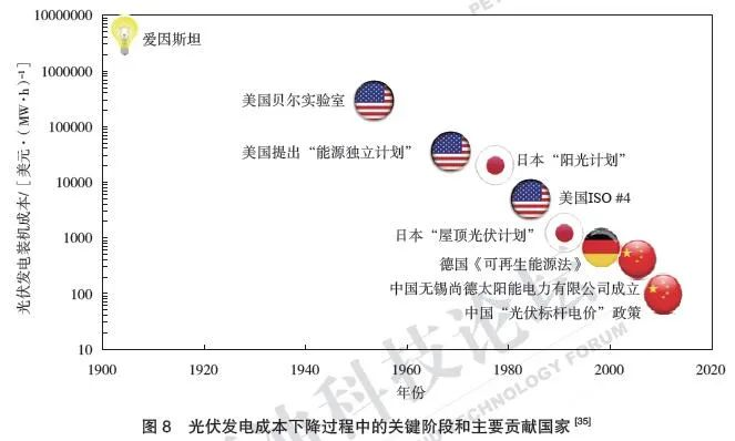 美國能源技術(shù)和公共政策學(xué)者Gregory F. Nemet于2019年出版著作《光伏如何變得便宜》(How Solar Became Cheap),書中介紹了光伏發(fā)電技術(shù)在歷史上的不同發(fā)展階段、成本變化的關(guān)鍵驅(qū)動(dòng)因素、關(guān)鍵國家對成本降低的貢獻(xiàn),以及光伏發(fā)電對其他低碳能源技術(shù)發(fā)展的經(jīng)驗(yàn)?zāi)P汀9夥l(fā)電的4個(gè)關(guān)鍵階段為:(1)20世紀(jì)50—70年代美國早期實(shí)驗(yàn)室研究,推動(dòng)每兆瓦時(shí)的裝機(jī)成本從10萬美元級降到1萬美元級;(2)20世紀(jì)90年代的日本“屋頂光伏計(jì)劃”,推動(dòng)每兆瓦時(shí)裝機(jī)成本降至1000美元級;(3)21世紀(jì)初德國《可再生能源法》的發(fā)布實(shí)施,推動(dòng)裝機(jī)成本降至1000美元/(MW·h)以下;(4)中國以“光伏標(biāo)桿電價(jià)”等強(qiáng)力政策推動(dòng)產(chǎn)業(yè)發(fā)展,促進(jìn)裝機(jī)成本降至100美元/(MW·h)以內(nèi)(圖8)。
