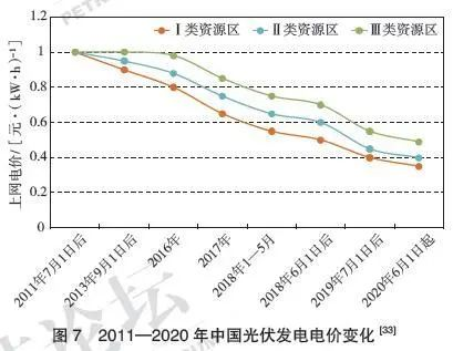 近年來,在全球可再生能源成本迅速下降的過程中,除了政策支持和技術(shù)進(jìn)步以外,產(chǎn)業(yè)規(guī)模經(jīng)濟(jì)和規(guī)模效益是不容忽視的重要推力。中國得益于較為完備的基礎(chǔ)工業(yè)體系和龐大的市場,在推動(dòng)風(fēng)電、光伏發(fā)電、生物質(zhì)發(fā)電、動(dòng)力電池、氫能利用等產(chǎn)業(yè)發(fā)展過程中,發(fā)揮了巨大的規(guī)模經(jīng)濟(jì)優(yōu)勢。2013年以來,在國家政策的大力支持下,中國光伏發(fā)電產(chǎn)業(yè)不斷擴(kuò)大規(guī)模,迅速發(fā)展為全球最大的市場,同時(shí)也擺脫了困擾光伏產(chǎn)業(yè)多年的“兩頭在外”的尷尬局面。2013—2018年,中國光伏裝機(jī)容量達(dá)到1.74×108kW,年復(fù)合增長率超過73%,較2012年的0.065×108kW增長26 倍。光伏發(fā)電上網(wǎng)電價(jià)從2011年的1元/(kW·h),下降到2020年的0.35~0.49 元/(kW·h)(2020年6月1日開始實(shí)施)(圖7)。在這一過程中,國內(nèi)涌現(xiàn)出一批優(yōu)秀的光伏企業(yè),在2019全球光伏企業(yè)20強(qiáng)排行榜上有16家中國公司,前10名中有7家中國公司。