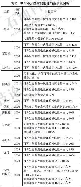 21世紀(jì)以來,全球能源格局發(fā)生重大變化,以美國頁巖氣革命為代表的非常規(guī)油氣開采量爆發(fā)式增長,可再生能源產(chǎn)業(yè)高速發(fā)展,全球能源消費(fèi)中心不斷向發(fā)展中國家轉(zhuǎn)移。這些因素促使中東國家對后石油時(shí)代進(jìn)行戰(zhàn)略思考。近年來,推進(jìn)能源轉(zhuǎn)型、擴(kuò)大可再生能源應(yīng)用比例逐步進(jìn)入政府部門的視野,沙特阿拉伯、阿聯(lián)酋、卡塔爾、科威特等國相繼制定了多項(xiàng)政策目標(biāo)(表2)。