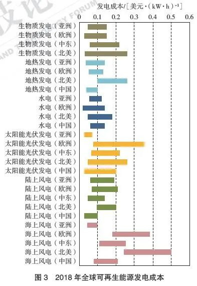 第三,可再生能源大規(guī)模開發(fā)利用。風(fēng)力發(fā)電和太陽能光伏發(fā)電成為全球成本下降最快、平均成本最低的可再生能源發(fā)電方式。2018年,除海上風(fēng)電以外,全球各地多種可再生能源發(fā)電技術(shù)的成本開始具備較強(qiáng)的成本競爭力(圖3)。在許多國家和地區(qū),可再生能源已開始了對化石能源發(fā)電的存量替代。中國是世界上可再生能源利用規(guī)模最大、平均成本最低的國家,從2014年開始,每年的風(fēng)電和太陽能發(fā)電量均超過全社會(huì)新增用電量。