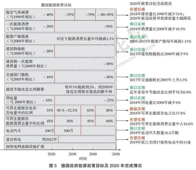 德國能源資源稟賦不佳,除了煤炭儲(chǔ)量相對豐富外,石油和天然氣高度依賴進(jìn)口。德國能源轉(zhuǎn)型實(shí)踐始于21世紀(jì)初,確立了“能源安全、經(jīng)濟(jì)效率和環(huán)境可承受”的能源政策三大目標(biāo),核心思想是可持續(xù)發(fā)展。2000年,德國出臺(tái)《可再生能源法》,確定了可再生能源發(fā)展的多項(xiàng)激勵(lì)措施,并分別在2004年、2009年、2012年、2014年針對實(shí)際情況做出修訂和調(diào)整。2014年底,德國頒布《國家能效行動(dòng)計(jì)劃》,對能源消費(fèi)總量、建筑能效和交通能效等提出行動(dòng)目標(biāo)??疾?020年之前所完成的半數(shù)轉(zhuǎn)型目標(biāo),與其他國家相比,德國是能源轉(zhuǎn)型的“優(yōu)等生”(圖5)。
