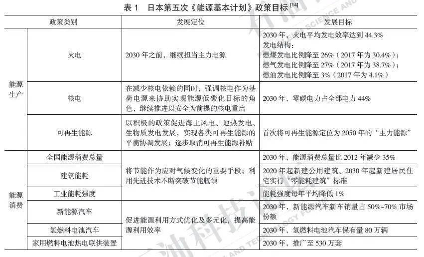日本能源消費(fèi)高度依賴進(jìn)口,能源自給率低于10%,是發(fā)達(dá)國家中能源自給率最低的國家之一。日本能源轉(zhuǎn)型戰(zhàn)略的主要思路不拘泥于能源自給率,著力通過能源技術(shù)優(yōu)勢彌補(bǔ)資源稟賦的劣勢,將能源技術(shù)能力作為保障能源安全、穩(wěn)定能源供給、優(yōu)化能源結(jié)構(gòu)和提高產(chǎn)業(yè)競爭力的戰(zhàn)略性手段。2018年,日本發(fā)布了第五次《能源基本計(jì)劃》,提出了能源轉(zhuǎn)型戰(zhàn)略的新目標(biāo)、新路徑和新方向(表1)。