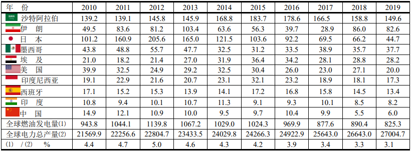 2010~2019年前十位國家燃油發(fā)電(單位:TWh)