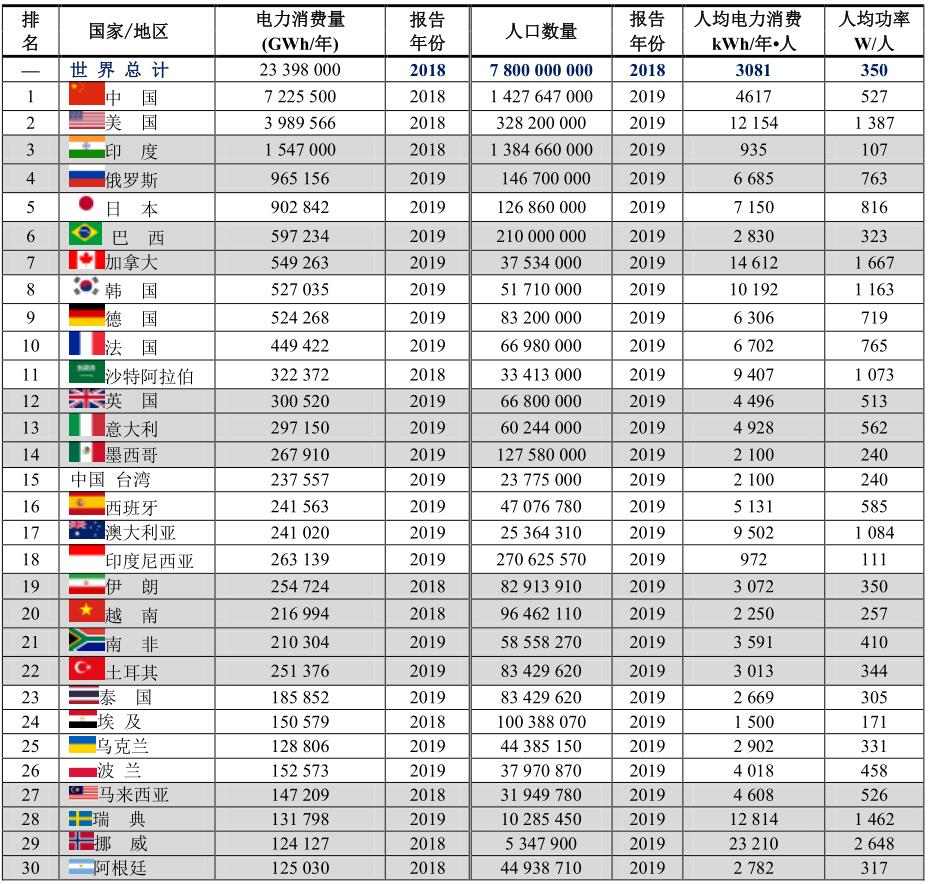 全球電力消費(fèi)最高的30個(gè)國(guó)家和地區(qū)