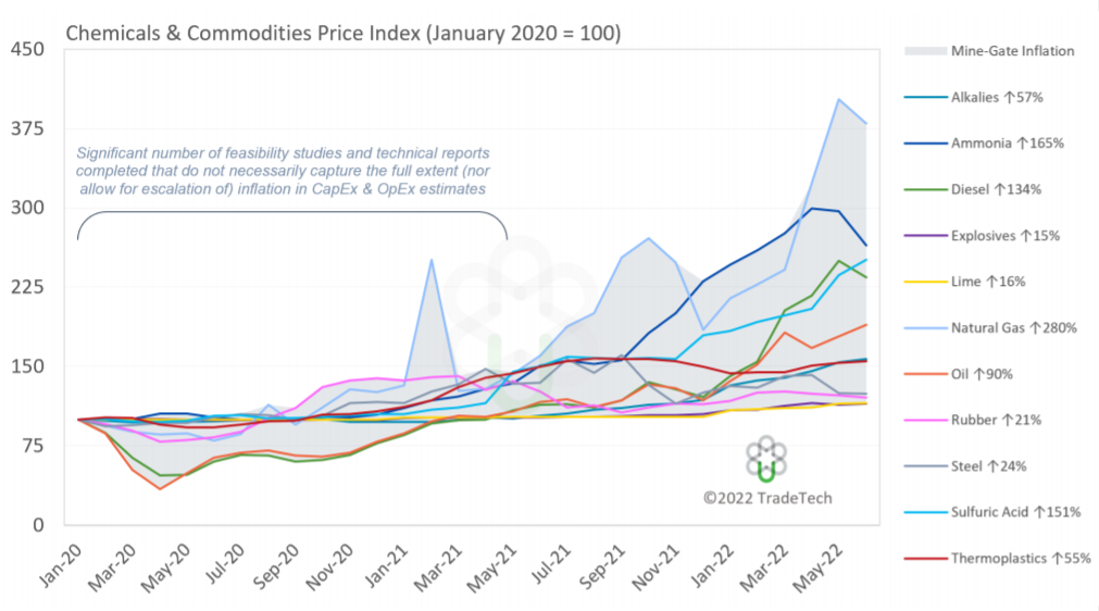 鈾礦山生產(chǎn)所需原材料價(jià)格上漲情況(Quote: TradeTech)
