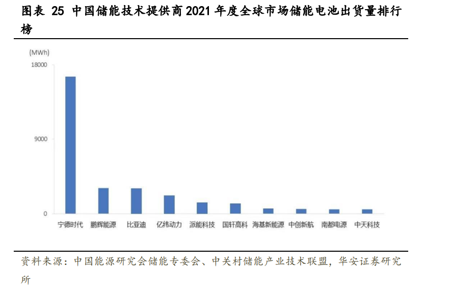 與動力和大儲相比,戶用儲能對電芯技術(shù)的要求相對放寬。戶用場景對電池能量密 度等要求相對較低,影響用戶體驗的主要是產(chǎn)品整體設(shè)計,包括電池管理和全屋能源調(diào) 配等,對電芯性能的要求相對放寬,主要強調(diào)安全性和降本。 封裝路線尚無定型。戶用儲能系統(tǒng)規(guī)模在 10kWh 級別,大圓柱電池(單體容量 10Ah50Ah),方形(50Ah-300Ah),軟包(30Ah-80Ah)方案均有公司選用,目前戶儲采用的 電芯封裝路線并無定型。 小電芯或?qū)⒊蔀閼魞χ髁鳌.?dāng)前歐洲戶儲市場正經(jīng)歷低壓向高壓系統(tǒng)的產(chǎn)品迭代。 高電壓平臺可降低電流,從而控制系統(tǒng)發(fā)熱量,提高放電效率。儲能系統(tǒng)容量不變的情 況下,高壓系統(tǒng)對應(yīng)的電芯容量減小。例如,低壓平臺儲能電芯多為 100Ah,高壓平臺逐 漸向 50Ah 過渡。100Ah 以下小容量電池在戶用家儲領(lǐng)域仍有較長的應(yīng)用生命周期。 目前我國主要儲能電池提供商多為動力電池制造商。根據(jù) GGII 統(tǒng)計,2021 年國內(nèi) 儲能電池出貨量 48GWh,其中電力儲能電池出貨量 29GWh,同比增長 339%;而根據(jù)全球 研究機(jī)構(gòu) EVTank 與伊維經(jīng)濟(jì)研究院共 2021 年全球儲能電池出貨量 66.3GWh,同比增長 132.6%,電力系統(tǒng)儲能是主要增量貢獻(xiàn)。2021 年,全球市場中,儲能電池出貨量排名前 十位的中國儲能技術(shù)提供商,依次為:寧德時代、鵬輝能源、比亞迪、億緯動力、派能 科技、國軒高科、?;履茉?、中創(chuàng)新航、南都電源和中天科技。