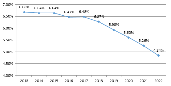 據(jù)中電聯(lián)快報(bào)數(shù)據(jù),2022年全國線損率4.84%,同比下降0.42個(gè)百分點(diǎn),保持繼續(xù)下降走勢(shì),較2013年下降了1.84個(gè)百分點(diǎn)。