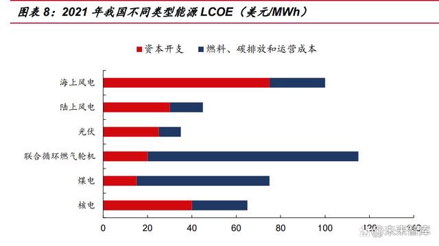 核電項(xiàng)目初期建設(shè)投資高,但綜合考慮運(yùn)營(yíng)、燃料、廢物處理費(fèi)用后的全生命周 期成本后,競(jìng)爭(zhēng)力凸顯。即使三代核電造價(jià)提升,其經(jīng)濟(jì)性仍然很強(qiáng)。而且國(guó)內(nèi)核電 設(shè)計(jì)壽命 40-60 年有余量,到期后一般會(huì)申請(qǐng)延壽 20 年,進(jìn)一步增強(qiáng)了核電的盈利 能力。用平準(zhǔn)化度電成本 LCOE 來(lái)評(píng)測(cè),根據(jù) IEA 測(cè)算,2021 年我國(guó)壓水堆核電站 LCOE 約為 65 美元/MWh,僅次于光伏的 35 美元/MWh 和陸風(fēng)的 45 美元/MWh,且 相對(duì)煤電具有優(yōu)勢(shì)。作為基荷能源,考慮長(zhǎng)期運(yùn)營(yíng)成本,從成本端對(duì)火電、燃?xì)獍l(fā)電 擁有極強(qiáng)替代能力。