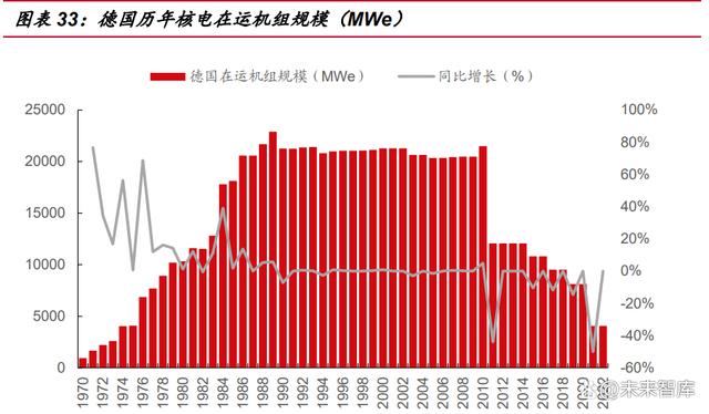 核事故安全問(wèn)題引發(fā)民眾反對(duì)態(tài)度,德國(guó)核電走出倒 U 型曲線。同樣受到 1974 年能源危機(jī)影響,能源獨(dú)立問(wèn)題受到關(guān)注,德國(guó)大力發(fā)展核電,直到 1989 年前德國(guó) 核電裝機(jī)都處于快速增長(zhǎng)狀態(tài)。1986 年切爾諾貝利事故后,德國(guó)核電發(fā)展陷入停滯, 最后一座新核電站于 1989 年投入使用。 2011 年福島核事故后,德國(guó)走上了堅(jiān)定退核的道路。到 2011 年初,德國(guó) 17 座 核電機(jī)組規(guī)模 21.5GW,占總電源裝機(jī)容量的 15%,核電發(fā)電量比例接近 30%。2011 年 12 月福島核電站事故后,德國(guó)多臺(tái)核電機(jī)組關(guān)停,2011 年底核電在運(yùn)規(guī)模驟降至12.1GW,2022 年底僅余 3 臺(tái)機(jī)組。規(guī)模 4.1GW。受俄烏事件和北溪管道事故影響, 德國(guó)宣布暫緩核電退出計(jì)劃,推遲關(guān)停原定 2022 年內(nèi)退役的 3 座核電站。