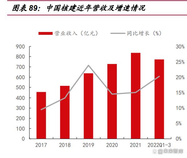 中國(guó)核建成立于 2010 年,于 2016 年上市,主營(yíng)業(yè)務(wù)為核電工程、工業(yè)和民用 工程建設(shè),2018 年中核建設(shè)集團(tuán)與中核集團(tuán)實(shí)行戰(zhàn)略重組推動(dòng)企業(yè)改革。公司正高 水平推進(jìn) “國(guó)際熱核聚變實(shí)驗(yàn)堆”項(xiàng)目建設(shè),已成功實(shí)現(xiàn)主機(jī)安裝第一階段任務(wù),國(guó)際 品牌影響力顯著提升。公司 2022 年非公開發(fā)行募集資金約 25 億元投入建筑工程項(xiàng) 目,拓寬民用工程業(yè)務(wù)布局。 2022 年公司收入穩(wěn)健增長(zhǎng),2022 年前三季度公司實(shí)現(xiàn)營(yíng)業(yè)收入 772.8 億元,同 比上升 20.3%,歸母凈利潤(rùn) 12.8 億元,同比上升 22.8%。根據(jù)公司經(jīng)營(yíng)情況簡(jiǎn)報(bào), 2022 年全年?duì)I業(yè)收入 981.4 億元,同比上升 17.2%,據(jù)此計(jì)算,2022 年第四季度營(yíng) 業(yè)收入 208.6 億元,同比上升 7.2%。訂單方面,公司 2022 年前三季度累計(jì)新增訂 單 995.2 億元,同比提升 2%,根據(jù) 2022 年 12 月發(fā)布的公開投資者調(diào)研情況公告披 露,2022 年全國(guó)共核準(zhǔn) 10 臺(tái)核電機(jī)組,8 臺(tái)已完成招投標(biāo),公司全部參與且全部中 標(biāo),剩余 2 臺(tái)仍在投標(biāo)前期階段,公司有望憑借高資質(zhì)、豐富的建造經(jīng)驗(yàn),持續(xù)中標(biāo) 核島工程訂單。