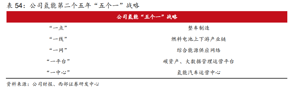 率先布局氫能全產(chǎn)業(yè)鏈,全面啟動(dòng)“五個(gè)一”戰(zhàn)略。公司于 2017 年在氫能產(chǎn)業(yè)鏈領(lǐng)先廣 泛布局,至 2021 年完成氫能發(fā)展的第一個(gè)五年規(guī)劃,目前已經(jīng)搭建了上游氫氣的“制-儲(chǔ)運(yùn)-加”氫能供應(yīng)體系、中游“膜電極-燃料電池電堆及系統(tǒng)-整車制造”核心裝備產(chǎn)業(yè)鏈,以及 下游六大區(qū)域氫能示范應(yīng)用的三 維格局,形成從研發(fā)—生產(chǎn)制造—商業(yè)化應(yīng)用的“氫能源 全生命周期”創(chuàng)新生態(tài)鏈。2022 年,公司啟動(dòng)氫能產(chǎn)業(yè)第二個(gè)五年計(jì)劃,確立“五個(gè)一”戰(zhàn) 略。