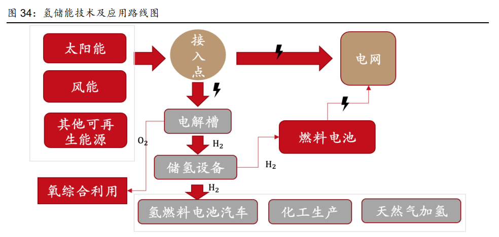 與其他儲能方式相比,氫能更能滿足大規(guī)模、長時間消納需求。與抽水儲能、鋰電池儲能 等方式相比,其具有邊際成本低、能量密度大、無自衰減等優(yōu)勢,能夠?qū)崿F(xiàn)跨周、跨季儲 能。但其實際應(yīng)用需要經(jīng)過光伏發(fā)電到制氫再由儲氫發(fā)電的兩次轉(zhuǎn)換,短期內(nèi)儲能效率較 低。鋰電儲能的效率更高,適用于日度調(diào)峰;氫能更針對于大規(guī)模儲能和季度調(diào)峰,擴容 只需要增加儲氫設(shè)備,邊際成本更低。