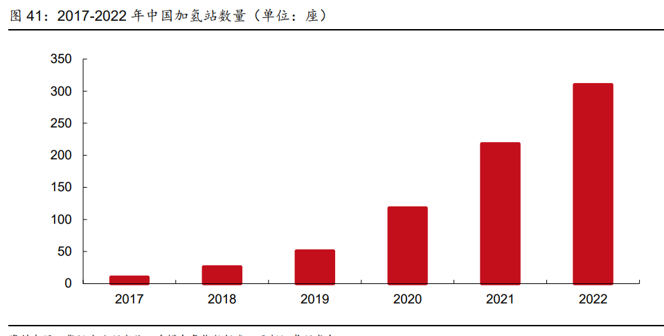加氫站布局加快,逐漸形成網(wǎng)絡(luò)。加氫站等基礎(chǔ)設(shè)施是否完善是影響消費者購買氫燃料電 池汽車熱情的主要因素。隨著國內(nèi)氫燃料電池汽車累計銷量增加,中石化、中石油等能源 央企不斷加大加氫基礎(chǔ)設(shè)施的投資和建設(shè)力度,國內(nèi)加氫站數(shù)量呈現(xiàn)快速增長趨勢。截至 2022 年底,我國加氫站累計建成數(shù)量達到 274 座。根據(jù) 2020 年中國汽車工程學(xué)會發(fā)布 的《節(jié)能與新能源汽車技術(shù)路線圖 2.0》相關(guān)規(guī)劃,到 2035 年加氫站的建設(shè)目標為至少 5000 座,中國未來加氫基礎(chǔ)設(shè)施的市場規(guī)模在 2030-2050 年將突破千億。此外,我國加 氫站建設(shè)參與主體呈現(xiàn)多樣化趨勢,采取規(guī)?;ㄔO(shè)或加油/加氫/加氣站合建等方式來拓 展加氫基礎(chǔ)設(shè)施網(wǎng)絡(luò),單位加注成本也有望下降。