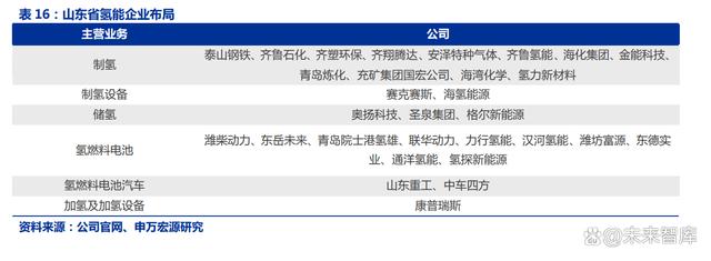 山東依靠扎實的氫能產(chǎn)業(yè)鏈落實“氫進萬家”政策,未來氫能發(fā)展將與燃料電池示范城市群平行。山東省企業(yè)布局: