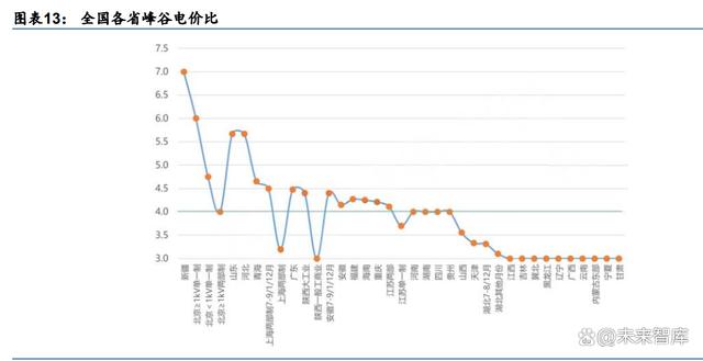 國(guó)家發(fā)改委推動(dòng)合理拉大峰谷電價(jià)差,引導(dǎo)電力用戶削峰填谷。2021 年 7 月,國(guó)家發(fā)改委 印發(fā)《關(guān)于進(jìn)一步完善分時(shí)電價(jià)機(jī)制的通知》,部署各地進(jìn)一步完善分時(shí)電價(jià)機(jī)制,合理拉 大峰谷電價(jià)價(jià)差,為引導(dǎo)電力用戶削峰填谷、促進(jìn)儲(chǔ)能加快發(fā)展釋放了清晰強(qiáng)烈的價(jià)格信 號(hào):(1)優(yōu)化峰谷電價(jià)機(jī)制:積極優(yōu)化峰谷電價(jià)機(jī)制,科學(xué)劃分峰谷時(shí)段,合理確定峰谷 電價(jià)價(jià)差,系統(tǒng)峰谷差率超過 40%的地方,峰谷電價(jià)價(jià)差原則上不低于 4:1;其他地方原 則上不低于 3:1。(2)建立尖峰電價(jià)機(jī)制:在峰谷電價(jià)的基礎(chǔ)上推行尖峰電價(jià)機(jī)制,主要基 于系統(tǒng)最高負(fù)荷情況合理確定尖峰時(shí)段,尖峰電價(jià)在峰段電價(jià)基礎(chǔ)上上浮比例原則上不低 于 20%??蓞⒄占夥咫妰r(jià)機(jī)制建立深谷電價(jià)機(jī)制。隨后,各省市分時(shí)電價(jià)政策步入快速完 善期,出臺(tái)相關(guān)政策調(diào)整峰谷時(shí)段劃分和電價(jià)浮動(dòng)比例。