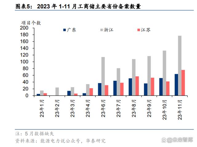多因素推動(dòng),23 年高增趨勢(shì)初現(xiàn)。根據(jù)能源電力說公眾號(hào)的不完全統(tǒng)計(jì),僅 2023 年 7-11 月,國(guó)內(nèi)工商業(yè)儲(chǔ)能備案項(xiàng)目個(gè)數(shù)達(dá) 1305 個(gè)。從工商業(yè)分布較為集中的廣東、浙江、江蘇 三個(gè)省份來看,月度備案項(xiàng)目數(shù)量均呈現(xiàn)大幅上升趨勢(shì)。據(jù)不完全統(tǒng)計(jì),2023 年以來我國(guó) 工商業(yè)儲(chǔ)能備案規(guī)模已經(jīng)達(dá)到 3.46GW/9.26GWh。工商業(yè)儲(chǔ)能高速增長(zhǎng)的勢(shì)頭已經(jīng)初步顯 現(xiàn),2023 年成為國(guó)內(nèi)工商儲(chǔ)的放量元年。